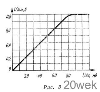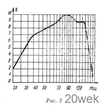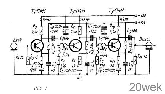 Принципиальная схема усилителя приведена на рис 1. Он предназначен для приема первых пяти телевизионных каналов и имеет полосу пропускания от 35 до 145 Мгц на уровне 0,7 (рис. 2). Максимальный коэффициент усиления (на частоте 80 Мгц) равен 10. Амплитудная характеристика усилителя приведена на рис. 3. Усилитель собран на трех транзисторах типа П411 по схеме с общим эмиттером для переменной составляющей со сложной коррекцией в цепях эмиттера и коллектора. Каждый каскад усилителя имеет высокое входное сопротивление. Разделительные конденсаторы С2, С5 и С9 типа КСО служат для межкаскадного согласования. Конденсаторы СзС6С11 типа КТК или КДК и дроссели Др1, Др2, Др3 и Др4 — для коррекции высокочастотной части характеристики. Входное и выходное сопротивление усилителя — 75 ом. Коаксиальный кабель с волновым сопротивлением 75 ом (РК—1, РК—3 и т. п.) непосредственно подключается ко входу и выходу усилителя. Усилитель собран на плате из фольгированного стеклотекстолита толщиной 2,5 мм размерами 134X51 мм. Дроссели Др1, Др2, Др3 и Др4 намотаны проводом ПЭЛШО-0,15 на сопротивлениях типа МЛТ-0,5 вт и содержат Др1 и Др2 по 3 витка, а Др3 и Др4 по 21 витку.