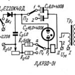 Фотореле. Фотореле собрано по обычной схеме на лампе 6П6С (Л1). Датчиком служит полупроводниковое фотосопротивление типа ФСК-1. Принципиальная схема фотореле с коммутацией дана на рис. 5. В качестве реле Р можно использовать любое реле с сопротивлением обмотки 300—1000 ом и током срабатывания 15— 20 ма с нормально разомкнутыми контактами. Силовой трансформатор Тр1 намотан на сердечнике Ш20 X 30 мм. Сетевая обмотка на 220 в содержит 1980 витков провода ПЭЛ 0,23, повышающая обмотка имеет 2 X 1440 витков провода ПЭЛ 0,16, накальная обмотка — 56 витков провода ПЭЛ 1,0. При расчете сделан запас на непрерывную работу силового трансформатора.