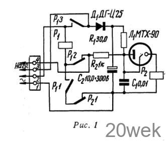 При нажатии кнопки КВ в момент времени, когда освещение выключено, к обмотке реле Р1 подводится питание от сети переменного тока 220 в, реле срабатывает, и кнопка блокируется замкнутыми контактами Р11 и Р21. Через контакты P13 включаются осветительные лампы и одновременно подводится питание к выпрямителю, собранному на германиевом диоде Д1 Выпрямленный ток, пульсации которого сглаживаются при помощи конденсатора С2, через сопротивление R1 начинает заряжать конденсатор C1. Когда на обкладках конденсатора напряжения достигает потенциала зажигания между сеткой и катодом тиратрона (для тиратрона типа МТХ-90 U=85 в) тиратрон зажигается. Конденсатор С1 разряжается через тиратрон и обмотку реле Р2. Реле срабатывает и выключает реле P1 размыкая цепь питания осветительных ламп.