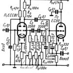 Для налаживания усилителя лучше пользоваться генератором ЗГ-11 (или другим звуковым генератором), осциллографом и ламповым вольтметром.