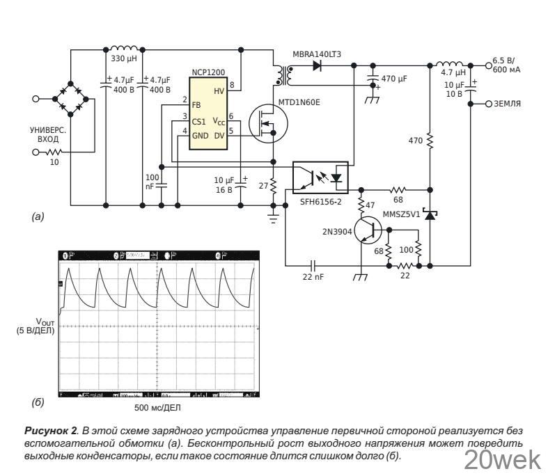 В нормальном режиме работы резисторы R1 — R3 гарантируют, что ни p-n-p, ни n-p-n транзистор не начнут проводить ток. Кроме того, R1 и R2 образуют делитель, который отслеживает напряжение VFB. Когда VFB увеличивается, напряжение на конденсаторе C1 растет, пока n-p-n транзистор не начнет притягивать базу p-n-p транзистора к земле. Это действие немедленно включает тиристор, который блокирует напряжение VFB почти до нуля. Когда VFB меньше 1.4 В, микросхема NCP1200 перестает выдавать импульсы до тех пор, пока тиристор не будет сброшен. Тиристор можно сбросить, отсоединив зарядное устройство от сетевой розетки. На Рисунке 3б показаны результаты этой операции и то, что при неисправной оптопаре операция безопасна. Когда оптопара выходит из строя, выходное напряжение растет до тех пор, пока тиристор не остановит работу микросхемы. Затем выходной конденсатор медленно разряжается, и напряжение VOUT опускается к уровню земли. Конденсатор C1 отфильтровывает любые помехи, возникающие при включении питания, которые могут привести к ложным срабатываниям тиристора.