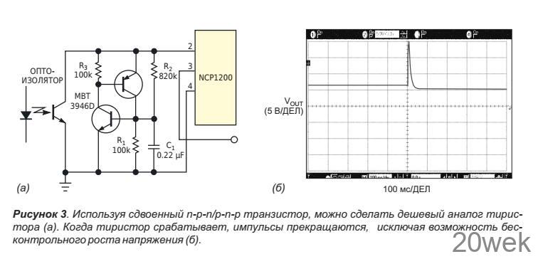 Чтобы избежать этой проблемы, можно использовать два простых биполярных транзистора для блокировки всего импульсного источника питания в случае отказа оптопары (Рисунок 3а). Биполярные транзисторы включаются по схеме эквивалента тиристора с использованием сдвоенной комплементарной пары, например, MBT3946D.