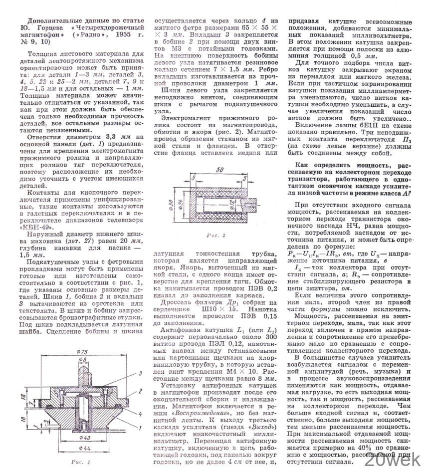 Переключатель дорожек П1а, П1б расположен рядом с универсальной головкой. Магнитные головки вместе с переключателем дорожек дополнительно экранируются алюминиевой крышкой толщиной 0,5 мм, устраняющей наводки на оголенные концы головок и переключателя. Катушка корректирующего контура намотана на каркас из органического стекла (см. рис. на вкладке) проводом ПЭВ 0,14 до заполнения каркаса. Катушка трансформатора высокочастотного генератора помещена в горшкообразный сердечник из карбонильного железа типа СБ-5А. Расположение обмоток указано на 1-й странице вкладки. Анодная обмотка содержит 2X200 витков провода ПЭВ 0,15, обмотка стирания — 50 витков провода ПЭВ 0,25 и обмотка подмагничивания — 180 витков провода ПЭВ 0,1. Выходной трансформатор используется от телевизора «Беларусь-5» или любой другой, рассчитанный на работу с лампой 6П14П и нагрузку 3,5 ома. Вторичная обмотка выходного трансформатора нагружена на два параллельно соединенных громкоговорителя типа 0,2 ГД-1 или на один выносной типа 4 ГД-1.