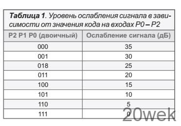 Схема такого генератора изображена на Рисунке 1. Диапазон частот 20 Гц — 20 кГц. Отличительная особенность генератора — достаточно высокая стабильность частоты и амплитуды синусоидального сигнала, низкие искажения сигнала, не превышающие 0.01%, и удобство в работе. В схеме применяется низкочастотная фильтрация тактовых прямоугольных импульсов заданной частоты [1]. Для этого в начале необходимо разделить тактовую частоту до требуемой звуковой частоты, а затем отфильтровать гармоники. Например, прямоугольный сигнал со скважностью 50% содержит только нечетные гармоники (3-ю, 5-ю, 7-ю и т. д.), а их амплитуды уменьшаются с частотой. Амплитуда 3-й гармоники составляет 1/3 амплитуды основной гармоники, 5-й — 1/5 амплитуды основной гармоники и так далее. Сначала с помощью кольцевого счетчика DD2 и цепочки взвешенных сопротивлений R8 — R11 ослабляются не менее чем на 70 дБ нежелательные гармоники входного сигнала с самой высокой амплитудой (ниже 9-й). Эллиптический фильтр нижних частот 8-го порядка с переключаемыми конденсаторами DA7 (MAX294) удаляет большую часть оставшихся гармоник. Граничная частота (частота среза) фильтра DA7 устанавливается входным тактовым сигналом как fCLK/100. Счётчик DD1 делит входящий тактовый сигнал на десять. Второй кольцевой счетчик DD2 также делит частоту на десять, но его выходы суммируются цепью взвешенных сопротивлений, чтобы получить 9-ступенчатую аппроксимацию синусоиды. Этот сигнал дополнительно фильтруется НЧ фильтром DA7, который ослабляет все гармоники ниже уровня шума. Входной тактовый сигнал на входе CLK служит тактовым сигналом для НЧ фильтра DA7, задающим частоту среза фильтра. Для достижения наименьших искажений вход DA7 должен быть смещен на VDD/2, а его входной сигнал ослаблен до пикового значения 2.2 В. Это ослабление достигается с помощью делителя напряжения, состоящего из выходного сопротивления взвешивающей цепи (R12 и R13 параллельно) и входного сопротивления ИС фильтра. Выходной сигнал генератора буферизируется повторителем DA4 (LMH6723), при этом максимальный выходной ток достигает 115 мА. Уровень выходного сигнала устанавливается цифровым потенциометром DA2 (DS1866) с логарифмической характеристикой изменения сопротивления. Двоичный код управления ослаблением сигнала на входах Р0 — Р2 цифрового потенциометра формируется кодирующим переключателем A6C-10R (N). Уровень ослабления сигнала в зависимости от значения кода на входах Р0 — Р2 показан в Таблице 1.