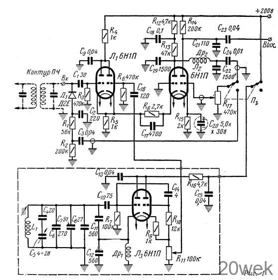Правый триод лампы Лз является буфером-усилителем и служит для развязки генератора от детектора. С катодной нагрузки усилителя (сопротивление R11) снимается напряжение, регулируемое в пределах 0-20 в, которое через конденсатор С16 подается на линейный детектор.