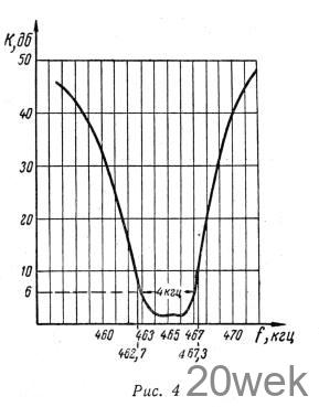 Типовая характеристика усилителя ПЧ с двумя каскадами и с применением индуктивно связанных контуров приведена на рис. 4. На частотной характеристике усилителя отмечают точки, соответствующие завалу в 6 дб. Допустим, они будут соответствовать частотам 463 и 467 кгц. Частота генератора биений устанавливается на 30 гц в сторону от этих точек вне полосы пропускания, то есть 462,7 кгц или 467,3 кгц (см. рис. 4).