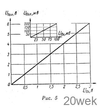 Основная характеристика детектора приведена на рис. 5, При изменении входного напряжения от О до 2 б выходное напряжение изменяется линейно от 0 до 4 в. Выходной сигнал измеряется непосредственно на выходе детектора, на сетке лампы усилителя НЧ. Измерения производились при частоте биений, равной 1000 гц.
