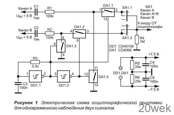 Приставка, Рисунок 1, содержит генератор тактовых импульсов на элементах «НЕ» микросхемы DD1 CD40106. Частота работы генератора задается цепочкой R3C3 и близка к 1 МГц. Противофазные сигналы с выходов генератора импульсов DD1.1 и инвертора DD1.2 подаются на управляющие ключи электронных переключателей — аналоговых коммутаторов DA1.1-DA1.4 микросхемы CD4066. Сигналы, поступающие со входов каналов А и В, поочередно подключаются к входу OY осциллографа. Переключатель SA1 предназначен для переключения входа осциллографа на канал A или B, либо для совместного наблюдения сигналов каналов A+B.