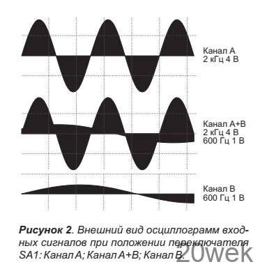 Приставка питается от биполярного источника постоянного напряжения ±2.5…7.5 В. Внешний вид сигналов, наблюдаемых на экране осциллографа при коммутации переключателя SA1, показан на Рисунке 2. Сигналы имеют высокочастотное заполнение, обусловленное использованием генератора тактовых импульсов, коммутирующего каналы А и B.