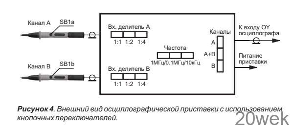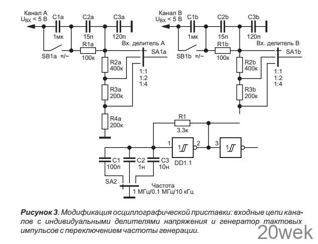 На Рисунке 3 показана модификация приставки — использование раздельных для каналов A и B входных делителей напряжения, кнопок SB1a и SB1b «=/~», а также ступенчатого переключателя SA2 частоты генератора тактовых импульсов.