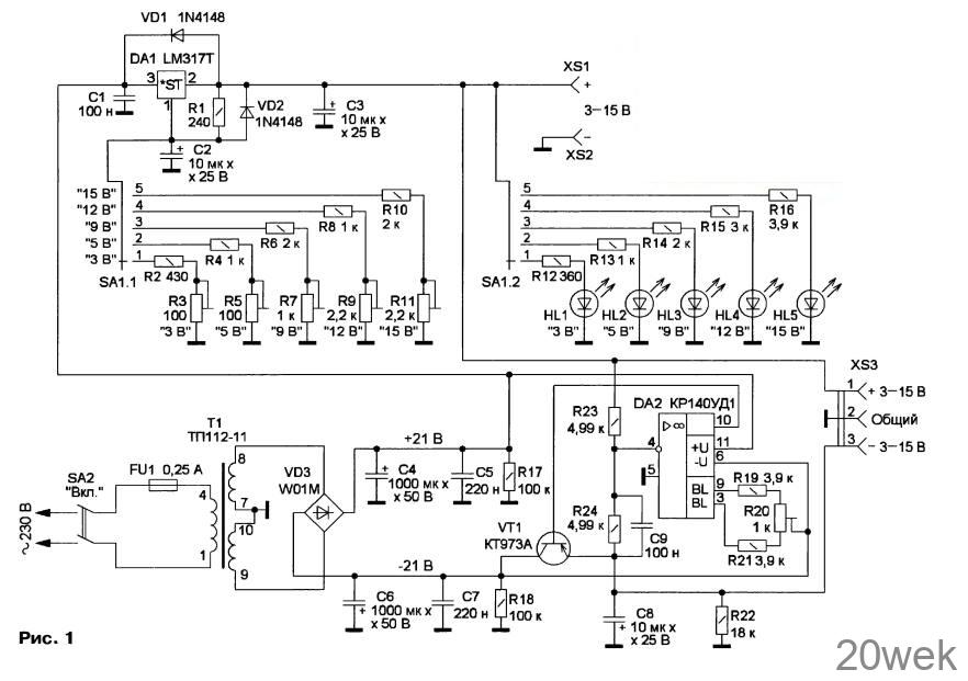 В плюсовую линию питания включена микросхема регулируемого напряжения DA1. Изменение выходного напряжения плюсовой полярности осуществляется с помощью переключателя SА 1.1, который подключает к выводу 1 микросхемы DA1 резисторы R2—R11, задающие точные значения выходного напряжения. Для UBblx = 3 В — R2, R3; для 11вых= 5 В — R4, R5; для 11вых = 9 В — R6, R7; для UBblx = 12 В — R8, R9; для 11вых = 15 В — RIO, R11. Переключатель SA1.2 служит для индикации с помощью светодиодов HL1—HL5 выбранного выходного напряжения. Резисторы R12—R16 — токоограничивающие, их номиналы подобраны так, чтобы яркость светодиодов была примерно одинакова. Конденсатор С1 нужен для повышения устойчивости работы микросхемы DA1, его надо разместить рядом с ней, это важно, если конденсаторы С4 и С5 удалены от неё. Конденсатор С2 улучшает подавление пульсаций. Диоды VD1 и VD2 предназначены для защиты микросхемы DA1, они обеспечивают быструю и безопасную разрядку конденсаторов С2 и СЗ в случае возникновения аварийных ситуаций. С выхода микросхемы DA1 плюсовое стабилизированное напряжение подаётся на разъёмы XS1 и XS3.