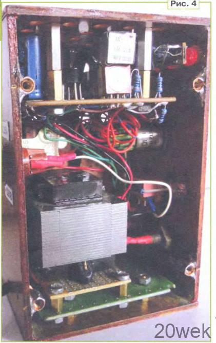 На рис. 4 показана внутренняя компоновка устройства. Внизу установлен трансформатор Т1, а над ним — макетная плата с элементами.