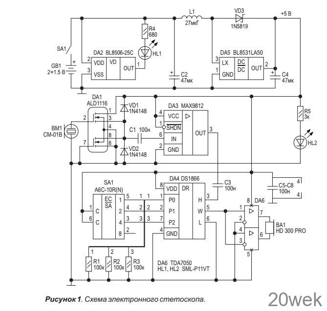 Схема электронного стетоскопа изображена на Рисунке 1. Основой прибора служит контактный микрофон СМ-01В (ВМ1), имеющий высокую чувствительность и низкий уровень шума. Контактные микрофоны улавливают звук не из воздуха, а фокусируются на вибрациях, исходящих от физических объектов, то есть контактный микрофон можно прикрепить к объекту и записывать его физические вибрации, а не звуковые волны, которые он создает в окружающем воздухе. Истоковый повторитель DA1 (ALD1116) с входным сопротивлением 1014 Ом согласует выходное сопротивление микрофона с входным сопротивлением предварительного микрофонного усилителя DA3 (MAX9812). Коэффициент усиления микрофонного усилителя фиксированный и равен 20 ± 1 дБ. Уровень выходного сигнала микрофонного усилителя устанавливается цифровым потенциометром DA4 (DS1866) с логарифмической характеристикой изменения сопротивления. Двоичный код управления ослаблением сигнала цифрового потенциометра формируется на входах Р0 — Р2 кодирующим двоичным переключателем SA1 (A6C-10R). Диапазон ослабления сигнала составляет 0 — 35 дБ с шагом 5 дБ. Далее выходной сигнал микрофонного усилителя подаётся на вход оконечного усилителя DA6 (TDA7050), нагрузкой которого являются наушники HD 300 PRO с сопротивлением 64 Ом. На такой нагрузке максимальная мощность оконечного усилителя составляет 50 мВт.