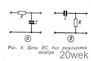 Необходимый сдвиг фаз для выполнения условия самовозбуждения создается при помощи ячеек из сопротивлений и конденсаторов. Для надежной работы такого генератора нужно включить не менее четырех фазосдвигающих ячеек. Частота генератора выбирается равной 5—7 гц. Действие частотного вибрато можно объяснить следующим образом. Напряжение, поступающее от генератора на управляющую сетку лампы предварительного усилителя НЧ, периодически перемещает рабочую точку левого триода лампы 6Н2П по вольтамперной характеристике. В результате напряжение звуковой частоты оказывается промоду- лированным напряжением генератора вибрато. Форма кривой напряжения вибрато близка к синусоидальной, это необходимо для получения хорошего вибрато. О. Тренин в своем инструменте предусмотрел возможность регулировки глубины (амплитуды) и частоты вибрато, однако в этом нет особой необходимости. Желаемую амплитуду и частоту вибрато можно установить при налаживании инструмента, не меняя ее в процессе игры. В этом случае отпадает надобность в потенциометрах R4, R5, Для подбора тембра звучания инструмента на вход предварительного усилителя НЧ можно включить цепь RC (рис. 4). Причем RC- цепь, показанная на рис. 4, а, подавляет высшие частоты и делает звучание инструмента более мягким, а RC-цепь, показанная на рис. 4, б, ослабляет низшие частоты, в результате чего звучание инструмента становится более резким. Подбирая величины сопротивлений и конденсаторов RC-цепи, можно установить желаемый тембр звучания гармоники.