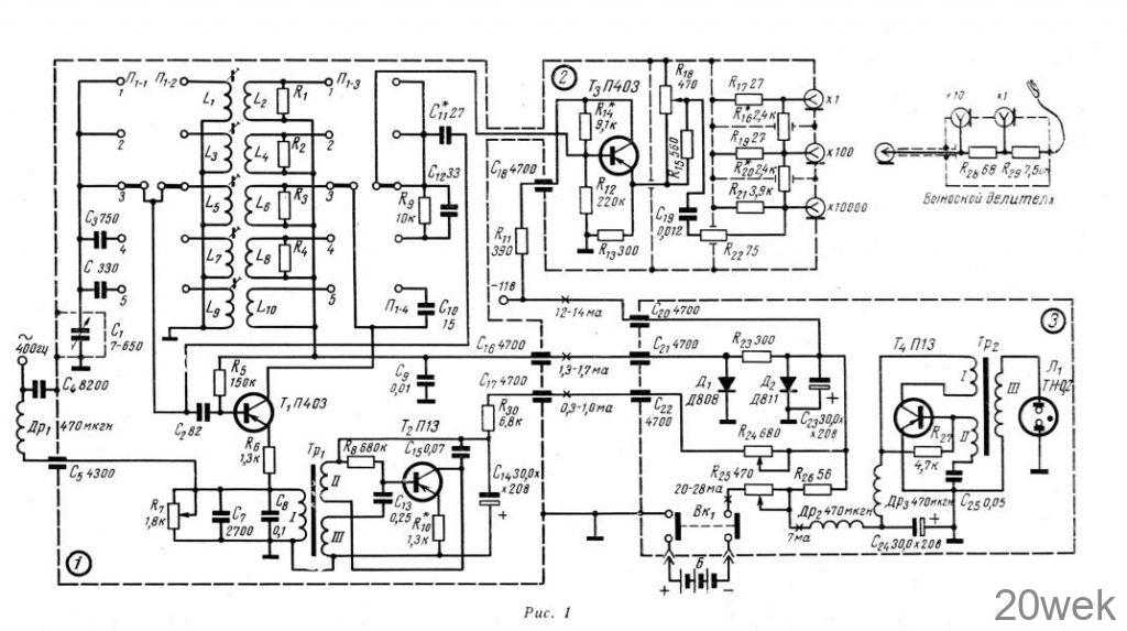 ВЧ генератор собран на транзисторе Т1 (П-403) по схеме с заземленным эмиттером и индуктивной обратной связью.