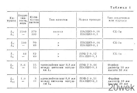 ВЧ генератор и катушки колебательных контуров собраны на гетинаксовой плате, которая устанавливается на переключателе диапазонов. Данные катушек индуктивности приведены в табл. 1.