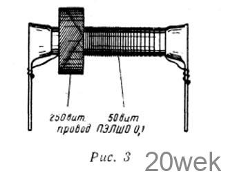 В генераторе сигналов применены сопротивления типа УЛМ и МЛТ-0,25, конденсаторы типа КДМ, КЛС, КПС и МБМ, электролитические конденсаторы типа ЭМ, дроссели типа Д-0,1. В случае самостоятельного изготовления дроссели выполняются на сопротивлениях ВС-1 так, как это показано на рис. 3. Провод типа ПЭЛШО-0,1, количество витков в первой секции 50—80, во второй — 180—250.