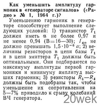 На пятом поддиапазоне форма выходного напряжения выбрана отличной от синусоидальной, благодаря чему становится возможной настройка аппаратуры по второй гармонике сигнала, то есть в диапазоне 20000 кгц — 40000 кгц.