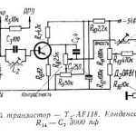 Модулятор выполнен на транзисторе Т2 (П13). Модулирующее напряжение вводится в эмиттерную цепь транзистора T1 c помощью сопротивления R7 осуществляется регулировка уровня модуляции. Требуемая амплитуда колебаний устанавливается сопротивлением R24. Конденсатор С7 обязательно должен быть слюдяным или керамическим, поскольку он предназначен для устранения влияния собственной индуктивности конденсатора С8. Режим работы модулятора стабилизируется отрицательной обратной связью по току, которая подбирается с помощью сопротивления R10. Подбором величины сопротивления R30 устанавливается требуемая величина питающего напряжения.