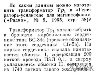 На рисунке приведена схема устройства на одном транзисторе Tv которое используется одновременно как генератор напряжения подмагничивания, усилитель звуковой частоты и смеситель сигнала звуковой частоты с сигналом подмагничивания. Генерируемая частота составляет около 30 кгц и зависит от величин индуктивности первичной обмотки трансформатора и емкости конденсатора С1 Напряжение звуковой частоты смешивается с напряжением подмагничивания в первичной обмотке трансформатора Тр1, записывающая головка включена в цепь вторичной обмотки Тр1 Амплитуда напряжения подмагничивания, поступающего на записывающую головку, зависит от величины емкости конденсатора С3