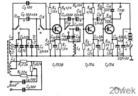 Первый и второй каскады усилителя, собранные на транзисторах П1ЗВ (T1) и П14 (Т2), нагружены на сопротивления R6 и R10 для того, чтобы они могли усиливать как НЧ, так и ВЧ сигналы. Между первым и вторым каскадами включены отсасывающие контуры (см. выше) для дополнительного повышения помехозащищенности ВЧ каналов. Конденсатор С11 установлен для дополнительного подавления токов НЧ канала.