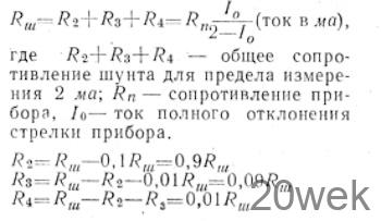 Следует учесть, что не всегда ток полного отклонения соответствует паспортным данным, и лучше всего проверить прибор. Сопротивления универсального шунта можно рассчитать по формулам: