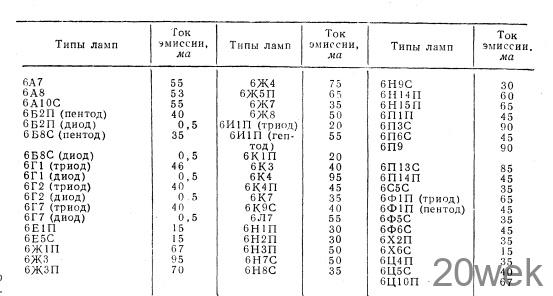 Таблица минимально допустимых значений тока эмиссии составлена автором в результате сравнения нескольких десятков экземпляров ламп каждой марки. Автор брал 50 экземпляров ламп каждого наименования, из них 20 совершенно новых, 20 бывших в эксплуатации, но работоспособных и 10 негодных с весьма малым током эмиссии. Предварительно проверив их прибором МИЛУ, он находил средние значения тока эмиссии 40 работоспособных ламп и максимальные — 10 отработанных, определял среднее арифметическое этих двух величин. Это и есть минимально допустимая величина тока эмиссии