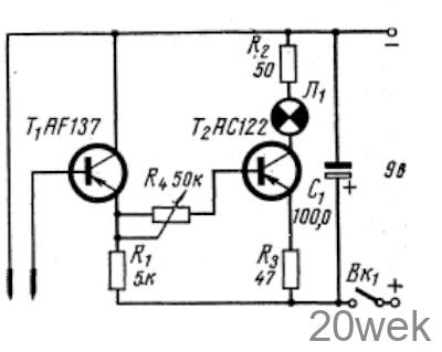 Если электроды не замкнуты, то база транзистора Т1 не подключена к минусу источника питания, по — этому транзистор Т1 заперт, и ток через него не проходит, не считая начального тока коллектора. При замыкании электродов через сопротивление исследуемой среды на базу транзистора Т1 подается отрицательное напряжение, и он отпирается. Проходящий в цепи эмиттера ток создает небольшое падение напряжения на сопротивлении R1. Это напряжение через потенциометр R4, который служит для регулировки чувствительности, подается на базу транзистора Т2. Ток через коллектор Т2 возрастает, и лампочка Л1 зажигается. Сопротивление R2 препятствует зажиганию лампочки Л1 на холостом ходу.