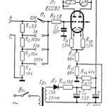 С помощью этого генератора можно снимать частотную характеристику полосовых или кварцевых фильтров. Частотный диапазон его 450—510 кгц. Напряжение, снимаемое с потенциометра R5, изменяется в пределах 3—1300 мв. Если необходимы меньшие значения напряжения, то используется выносной делитель напряжения. Общее потребление тока прибором — 1,5—2 ма. При умелом монтаже размеры генератора вместе с ящиком 90X 105X45 мм.