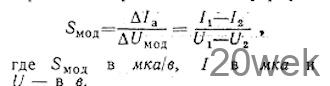 Затем определяют крутизну- модуляционной характеристики кинескопа Smод, которая представляет собой отношение изменения анодного тока дIa к изменению напряжения модулятора дUмод. Для этого можно воспользоваться схемой измерения, изображенной на рис. 1, б, подключив дополнительно к модулятору необходимый для отпирания и запирания кинескопа источник отрицательного напряжения в пределах 0-90 в. Изменяя это напряжение, по микроамперметру, включенному в цепь катода, устанавливают ток I1= 100 мка и замечают напряжение U1 на модуляторе. Затем устанавливают ток I2=1 мка, при котором кинескоп практически заперт, и вновь замечают напряжение U2 на модуляторе.