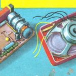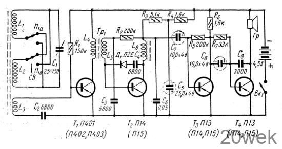 В приемнике применен самодельный громкоговоритель, изготовленный на основе капсюля типа ДЭМШ-1. Питается приемник от трех элементов типа ФБС-0,25 и потребляет 8—10 ма. В приемнике рекомендуется применять транзисторы со следующим коэффициентом усиления: Т1—40—80 (ток коллектора 0,8—1,5 ма); Т2—30—80 (ток коллектора 0,3—0,5 ма); Тз—20—30 (ток коллектора 0,3—0,5 ма); Т4— 40—80 (ток коллектора 4—6 ма).