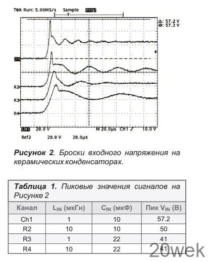 Формы напряжений в переходном режиме зависят от типов входных конденсаторов, как показано на Рисунке 3 и в Таблице 2. Опорный сигнал для конденсатора 22 мкФ и дросселя 1 мкГн показан на верхней осциллограмме (R1); его пик составляет 40.8 В.