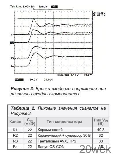 Чтобы конструкция входного фильтра была небольшой, желательно использовать керамические конденсаторы из-за их высоких допустимых значений пульсаций тока и низкого ESR. Приступая к проектированию, сначала необходимо определить минимальную емкость входного конденсатора. В примере было установлено, что достаточно керамического конденсатора 22 мкФ, 35 В. Броски входного напряжения, создаваемые этим конденсатором, показаны на верхней осциллограмме Рисунка 4 и в Таблице 3. Очевидно, что при использовании компонентов, рассчитанных на напряжение 30 В, возникнут проблемы