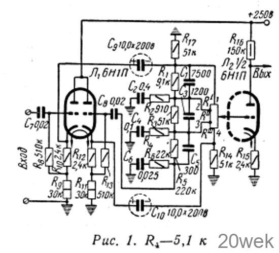 Для уменьшения шунтирующего влияния звеньев друг на друга необходимо выполнить условие: R1<=R3<=R5 и соответственно R2<=R4<=R6. Так как входное сопротивление делителя небольшое (меньше 10/кОм), он подключается к источнику сигнала через катодный повторитель, собранный на левом триоде Л1 (6Н1П).