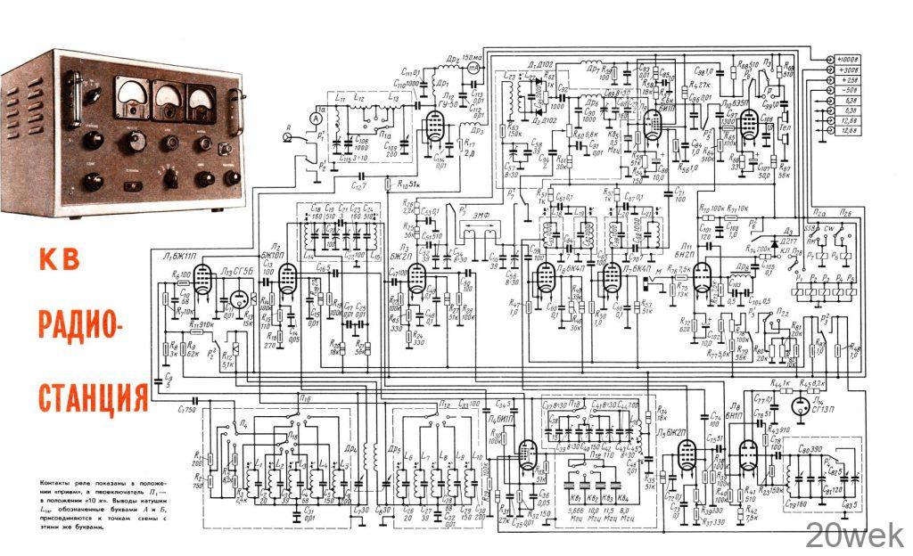 Радиостанция собрана по трансиверной схеме (рисунок) и подавляющая часть ее деталей и узлов используется как во время приема, так и при передаче. Радиостанция постоянно включена на прием. Для перехода на передачу нужно нажать ножную педаль. Род работы (CW, AM или SSB) устанавливается переключателем П2. При нажиме педали на реле Р1-Р7 подается постоянное напряжение (+25 в). Когда переключатель П2 установлен в положении «SSB» срабатывают все реле, кроме реле Р7. Тогда напряжение НЧ, развиваемое микрофоном, усиливается левым (по схеме) триодом лампы 6Н2П (Л11) и поступает на каскад усилителя мощности НЧ, собранный на лампе 6Э5П (Л16) К выходу этого каскада присоединен балансный модулятор на кремниевых диодах Д102 (Д1 и Д2).