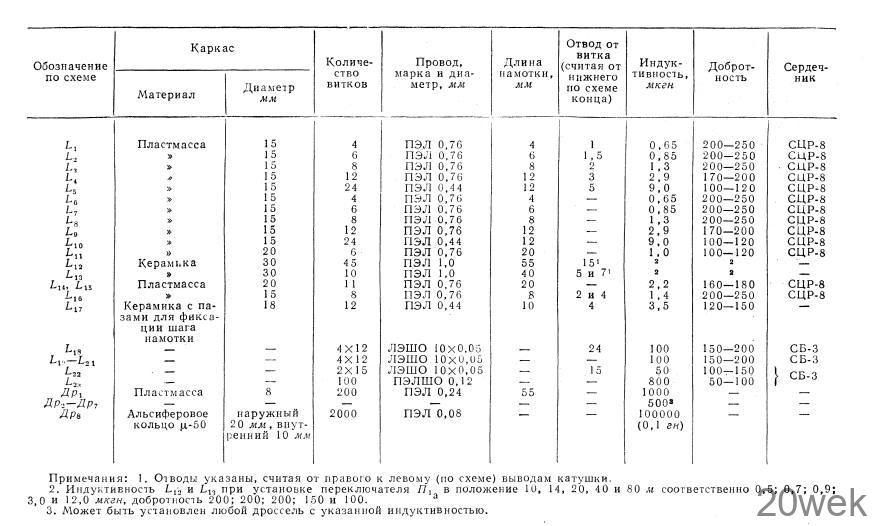 Конденсатор переменной емкости С109 должен иметь воздушный зазор между пластинами не менее 1мм. Сдвоенный блок переменных конденсаторов подстройки усилителя ВЧ С7,С8 изготовлен из двух подстроечных конденсаторов с воздушным диэлектриком. Строенный блок конденсаторов переменной емкости основной настройки C18,C23, С79 имеет верньер с замедлением 1:50. Контакты антенного реле P1 рассчитаны на ток не менее 1А. Большое значение имеет качество изоляции этого реле, так как она определяет потери на высоких частотах. Реле Р4— типа РЭС-10, остальные реле —- типа РЭС-9. Данные катушек индуктивности и дросселей приведены в таблице. Перед сборкой радиостанции их индуктивность и добротность надо обязательно проверить на Q-метре.