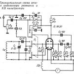 Генератор собран на лампе 6Ф1П (Л1), пентодная часть -которой используется в генераторе, а триодная часть — в катодном повторителе. Кварц Кв включен между экранирующей и управляющей сетками пентодной части 6Ф1П. Анодной нагрузкой последней служит активное сопротивление (Rз). Генератор вполне удовлетворительно работает в большом диапазоне частот (испытывались кварцы от 1,5 до 5 Мгц), и не требует органов настройки. Между генератором и усилителем включен катодный повторитель, который исключает влияние последующих каскадов на генератор. Кроме того, катодный повторитель легко согласуется с коаксиальным кабелем, что дает возможность установить генератор отдельно, в месте с невысокой температурой воздуха. Анодное напряжение лампы Л1 (+150 в) стабилизировано стабилитроном СГ4С или СГ1П (Л2).