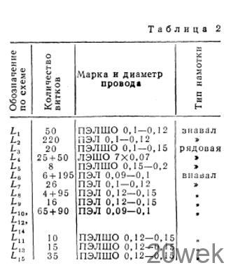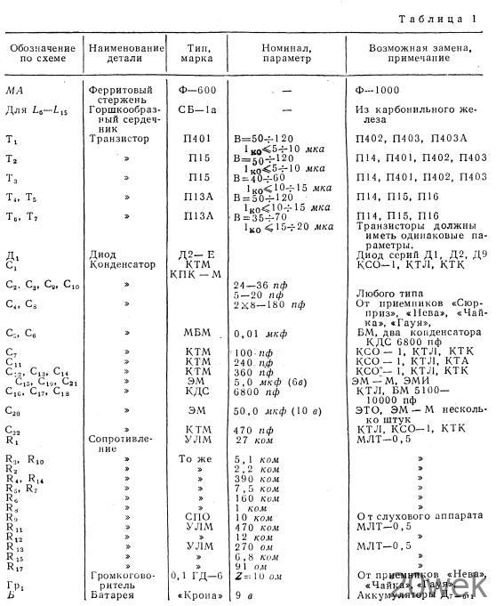 Детали приемника. В приемнике применены промышленные и самодельные детали. Перечень промышленных деталей, необходимых для постройки приемника приведен в таблице 1. Самостоятельно следует изготовить контурные катушки, трансформаторы, монтажную плату, переключатель диапазонов, футляр и некоторые другие мелкие детали.