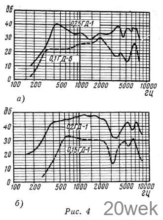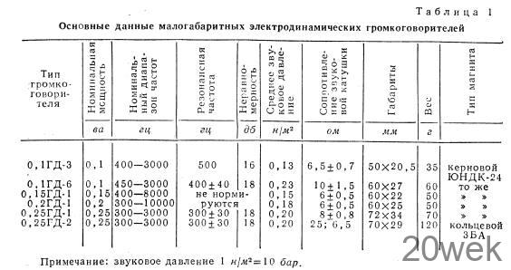 Отличительной особенностью всех малогабаритных громкоговорителей является достаточно высокая частота собственного резонанса подвижной системы, зависящая в первую очередь от размера диффузора. Как видно из таблицы 1, номинальная резонансная частота находится в пределах 300—500 гц, фактическое же ее значение в отдельных экземплярах громкоговорителей, особенно типов 0,15ГД-1 и 0,2ГД-1 иногда превышает 600 гц. Это приводит к ухудшению воспроизведения низших частот, так как отдача громкоговорителя резко снижается в области лежащей ниже частоты резонанса.