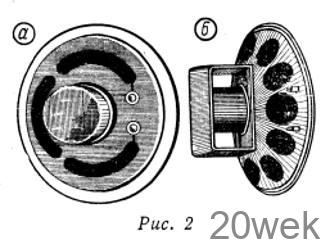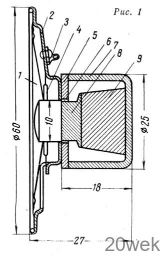 Первые четыре типа громкоговорителей, указанных в таблице 1, имеют конструктивно совершенно одинаковую закрытую магнитную систему со штампованным цилиндрическим магнитопроводом—стаканом, ко дну которого укрепляется магнит в форме усеченного конуса. Конструкция и размеры одного из таких громкоговорителей типа 0,1ГД- 6 показаны в разрезе на рис. 1, где 1 — диффузор, 2 — диффузородержатель, 3 — выводные лепестки (контакты), 4 — центрирующая шайба, 5 — передний флянец магнитопровода, 6 — звуковая катушка 7— магнитопровод (стакан), 8 — полюсной наконечник магнита, 9 — магнит. Аналогичны конструкции и внешний вид других громкоговорителей мощностью до 0,2 ва (0,1ГД-3, 0,15ГД-1 и 0,2ГД-1), незначительно различающихся главным образом в размерах. Громкоговорители мощностью 0,25 ва имеют магнитные системы совершенно иной конструкции. Громкоговоритель 0,25ГД-1 собран на керновом магните с магнитопроводом в виде скобы, а громкоговоритель 0,25ГД-2 имеет кольцевой магнит. Внешний вид громкоговорителей на мощность до 0,2 ва показан на рис. 2, а, на рис. 2, б — громкоговоритель типа 0,25ГД-1.