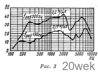 Поэтому, несмотря на то, что от малогабаритного громкоговорителя нельзя требовать хорошего воспроизведения самых низших частот, все же необходимо обеспечить рабочий диапазон от 300 гц. Для этого при установленном допуске на неравномерность частотной характеристики 15—18 дб частота собственного резонанса громкоговорителя не должна быть выше 400— 450 гц. Добиваться значительного понижения частоты резонанса не следует из-за уменьшения среднего уровня громкости. По этой причине для таких громкоговорителей низший предел резонансной частоты не должен быть ниже 250 гц. В подтверждение изложенных соображений на рис. 3 приведены частотноамплитудные характеристики двух одинаковых громкоговорителей с диффузором диаметром 60 мм, имеющих разные частоты собственного резонанса подвижной системы. Как видно из рис. 3, нижняя характеристика, которая фиксирует резонансную частоту порядка 190 гц, показывает худшую отдачу громкоговорителя как в области низших частот, так и меньшую среднюю отдачу по сравнению с громкоговорителем, имеющим резонанс на частоте 300 гц (верхняя характеристика на рис. 3). Указанное на этих характеристиках стандартное звуковое давление (при 0,1 ва приведенное к расстоянию 1 м) измерено на частоте 1500 гц и отмечено точкой с указанием значения в ньютонах на квадратный метр (1 н/м2= 10 бар). Это позволяет с учетом масштаба (50 дб) рассчитать среднее звуковое давление в рабочем диапазоне частот.
