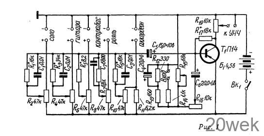 Принципиальная схема простого микшера приведена на рис. 1. Этот микшер предназначен для подключения к звукоусилителям киноустановок, но может быть присоединен и к другим аналогичным усилителям НЧ. Как видно из схемы, микшер состоит из каскада предварительного усиления НЧ, который имеет несколько входов, предназначенных для подключения микрофонов, расположенных около различных музыкальных инструментов, а также вход, позволяющий присоединить к микшеру приемник или магнитофон. Каждая входная цепь имеет глубоко регулируемые корректирующие ячейки и все цепи хорошо развязаны между собой. Это дает возможность осуществить микширование. Потенциометр R1(. служит для подбора соотношения громкостей двух разнородных передач при их смешивании. Микшер имеет низкоомный выход, что позволяет подключить его неэкранированным кабелем к оконечному усилителю, находящемуся на большом расстоянии. Микшер питается от одной батареи КБС-Л-0,5. Конструкция его может быть различной, налаживание сводится к подбору деталей, отмеченных на схеме звездочкой.