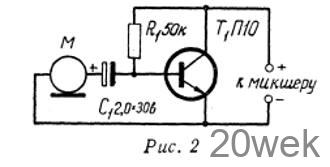 Между микрофонами (МД-41 или другими динамическими) и выходами микшера в непосредственной близости от первых необходимо установить простейшие микрофонные усилители, схема которых показана на рис 2. В этих усилителях применены малошумящие транзисторы П10 типа п—р—п. Можно также использовать р—п—р транзисторы (П14—П16), но при этом необходимо тщательно подобрать экземпляр с наименьшим уровнем собственных шумов. Микрофонные усилители можно смонтировать в подставке микрофона или непосредственно в кабеле. Они питаются от батареи микшера. Поэтому необходимо пометить полярность входных гнезд микшера и вилок микрофонных кабелей или применять для включения микрофонов специальные фишки. Точно также следует поступить с выходными гнездами микшера и вилкой кабеля к оконечному усилителю, так как включение здесь также не безразлично.