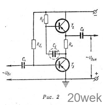 Второй каскад усилителя выполнен по несколько необычной последовательной схеме на двух транзисторах (рис. 2). Транзисторы по постоянному току включены последовательно. Т2 включен по схеме с общим эмиттером и нагружен сопротивлением RH и внутренним сопротивлением транзистора Т2. Переменное напряжение с сопротивления Rн подается на базу транзистора Т2, который со стороны выхода включен как эмиттерный повторитель.