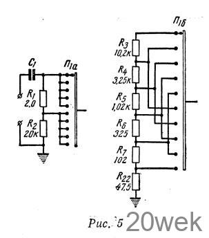 На схеме (рис. 1) величины сопротивлений делителей указаны для случая, когда прибор имеет две шкалы: одну для пределов измерения 10 мв, 100 мв и т. п., другую — для 30 мв, 300 мв и т. п., причем последние деления на двух шкалах совпадают. В этом случае милливольтметр калибруют так. На его вход от звукового генератора подают напряжение, по величине равное одному из пределов измерений, например 1 в, и контролируемое образцовым вольтметром. Переключатель пределов милливольтметра ставят в положение 1 в и; плавно вращая движок потенциометра R13, устанавливают стрелку гальванометра на последнее деление шкалы. Более удобна шкала, проградуированная в децибелах. В этом случае величины сопротивлений делителя надо изменить (рис. 5). Если коэффициент деления делителя равен 3,18, то деления двух соседних шкал отличаются на 10 дб.