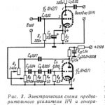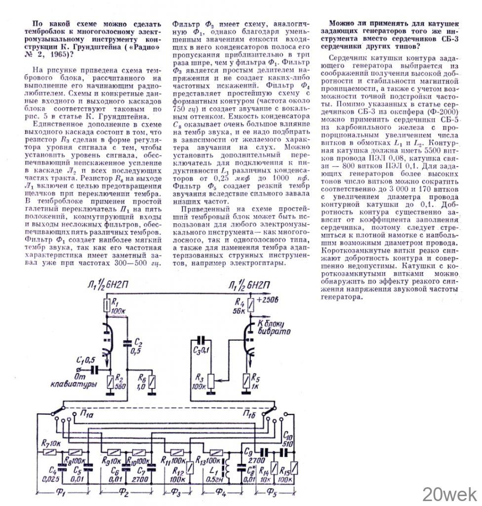 Предварительный усилитель и темброблок. Предварительный усилитель (рис. 5) поднимает уровень сигнала, приходящего с собирательной шины клавиатуры до уровня, необходимого для предотвращения фона в темброблоке. Усилитель выполнен по схеме с заземленной сеткой и представляет очень низкое нагрузочное сопротивление для собирательной шины клавиатуры, что тоже очень важно для предотвращения фона.