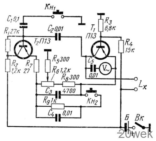 Если испытывают катушки весьма малой индуктивности, то дополнительно необходимо увеличить глубину положительной обратной связи. Это достигается нажатием кнопки Hu., (резистор и конденсатор С4 включаются параллельно потенциометру R6). При испытании катушек с большой индуктивностью, подвижной контакт потенциометра R6 следует установить в крайнее правое (по схеме) положение. Кнопка Кн2, как и при испытании малых индуктивностей, не нажата.
