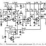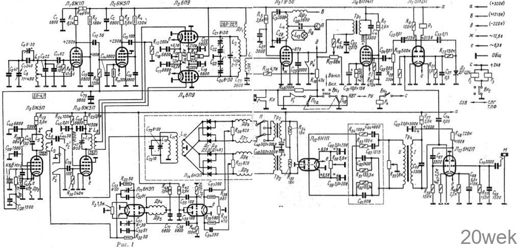 Передатчик предназначен для работы телеграфом, телефоном с амплитудной модуляцией и SSB в диапазоне 28,0—29,7 Мгц. Он собран на 13 радиолампах и девяти полупроводниковых диодах. При работе в телеграфном режиме используется семь, в телефонном режиме с амплитудной модуляцией — десять, а на SSB—11 радиоламп и девять полупроводниковых диодов. Принципиальная схема передатчика изображена на рис. 1.