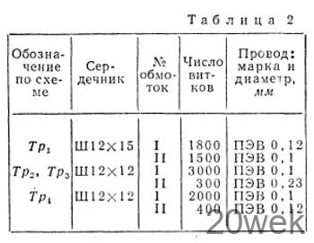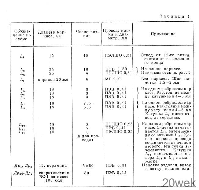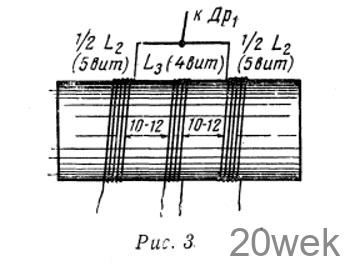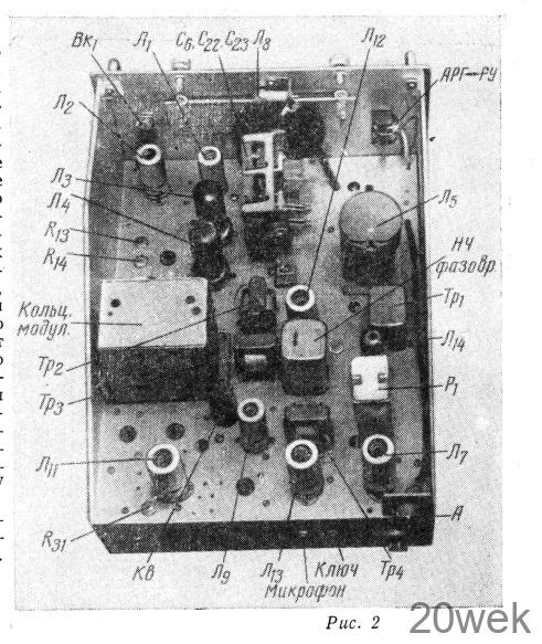 Внешний вид передатчика показан на рис. в заголовке статьи, а вид шасси сверху — на рис. 2. Шасси размерами 260X330X70 мм, а передняя панель — 280Х 195 мм. Подвал шасси разделен экранирующими перегородками. Кольцевые модуляторы заключены в экран размерами 80X57X90 мм и отделены друг от друга металлической перегородкой. Блок конденсаторов переменной емкости С6 С22 С23 взят от радиовещательного приемника II класса с УКВ диапазоном и переделан следующим образом. Из блока выпаивают одну секцию с большой емкостью и на ее место устанавливают (впаивают) секцию с малой емкостью, снятую из соседнего отсека. Таким образом получается строенный блок с одной секцией большой емкости и двумя малой емкости. Данные трансформаторов передатчика приведены в табл. 1, а катушек и ВЧ дросселей — в табл. 2. Катушки L2 L3 наматываются так, как показано на рис. 3.