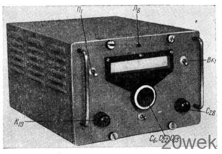 Затем тумблер Вк2 устанавливают в положение «ТЛГ—ТЛФ» и настраивают по ГИРу анодный контур лампы Л10 (L7С47) на частоту 25 Мгц. Вращая ползунки переменных сопротивлений R13 и R14, устанавливают указанные на принципиальной схеме (рис. 1) режимы ламп Лз и Л1 смесителя. При подаче на смеситель опорного напряжения с частотой 25 Мгц с катушки связи L8 и напряжения с частотой 3 Мгц от задающего генератора в анодном контуре смесителя (катушка L2) будет выделяться частота 28 Мгц. Эту частоту можно обнаружить с помощью приемника или ГИРа. Изменяя частоту задающего генератора от 3 Мгц до 4,7 Мгц, проверяют частоту колебаний на выходе смесителя, которая должна быть 28,0 Мгц— 29,7 Мгц